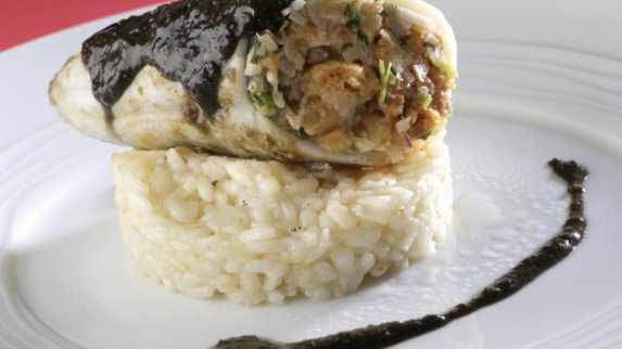 - 7. Servir les encornets farcis avec le risotto.